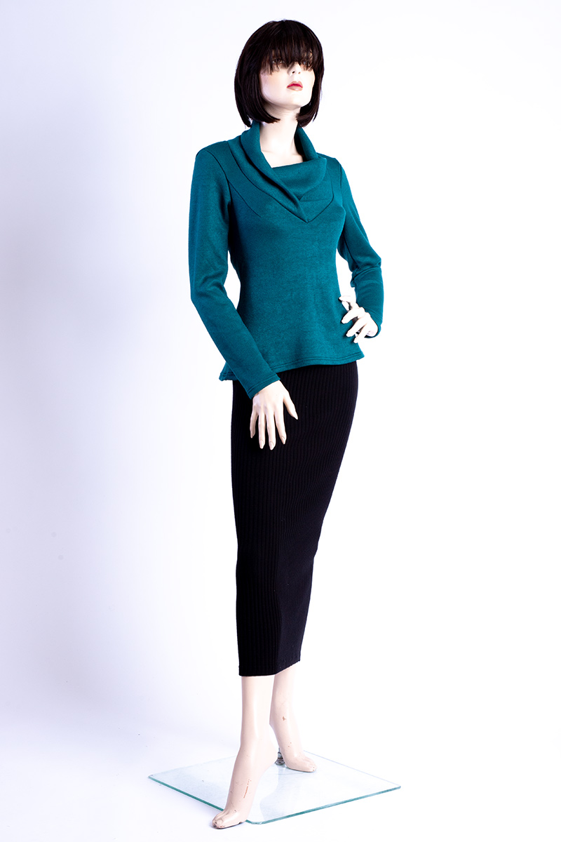 Auf den Fotos wurde er kombiniert mit unserem Rock ZOE RibBlack, ein Rippenstrickrock in schwarz.