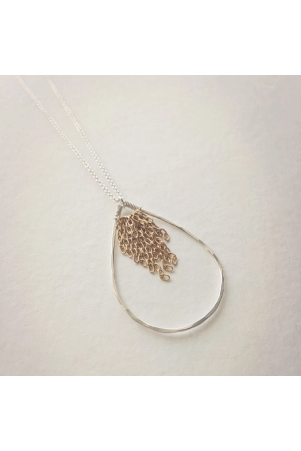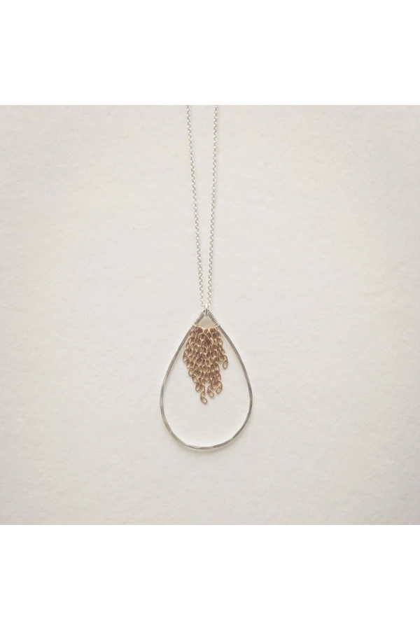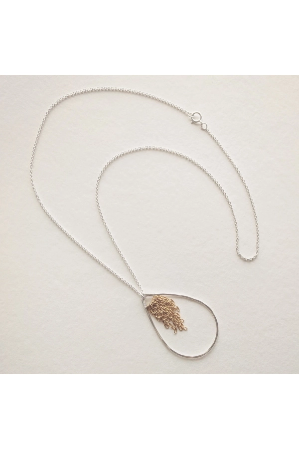 Elegante und moderne Halskette in Tropfenform mit Fransendetail auf der Innenseite. Die Tropfenform misst 1,75 Zoll. 45,7 cm in der Länge mit Federringverschluss. Ring und Kette aus Sterlingsilber mit Fransendetail aus 14-karätigem Gold. ✹ Die Reifen werden in unserem Schmuckstudio in New Orleans von Hand geformt, gelötet, gefeilt, gehämmert und poliert.