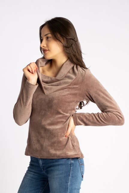 Der schmeichelnde Wasserfallkragen setzt das Dekolleté elegant in Szene. Die taillierte Form und das leichte Schößchen betonen die Figur, ohne einzuengen. Hinten ist LIZ etwas länger geschnitten – für einen modernen Look und optimalen Sitz. Die 3/4-Ärmel verleihen dem Shirt eine elegante Leichtigkeit.