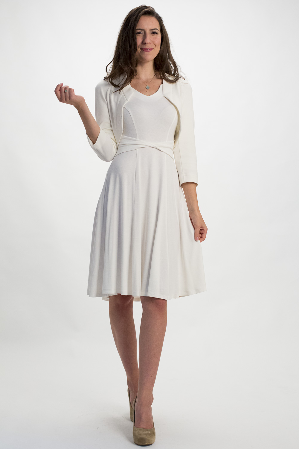 Der Bolero NELE ist wunderbar mit schmalen Jersey-Kleidern kombinierbar und kreiert durch seine schlichte Eleganz ein stilvolles Outfit.