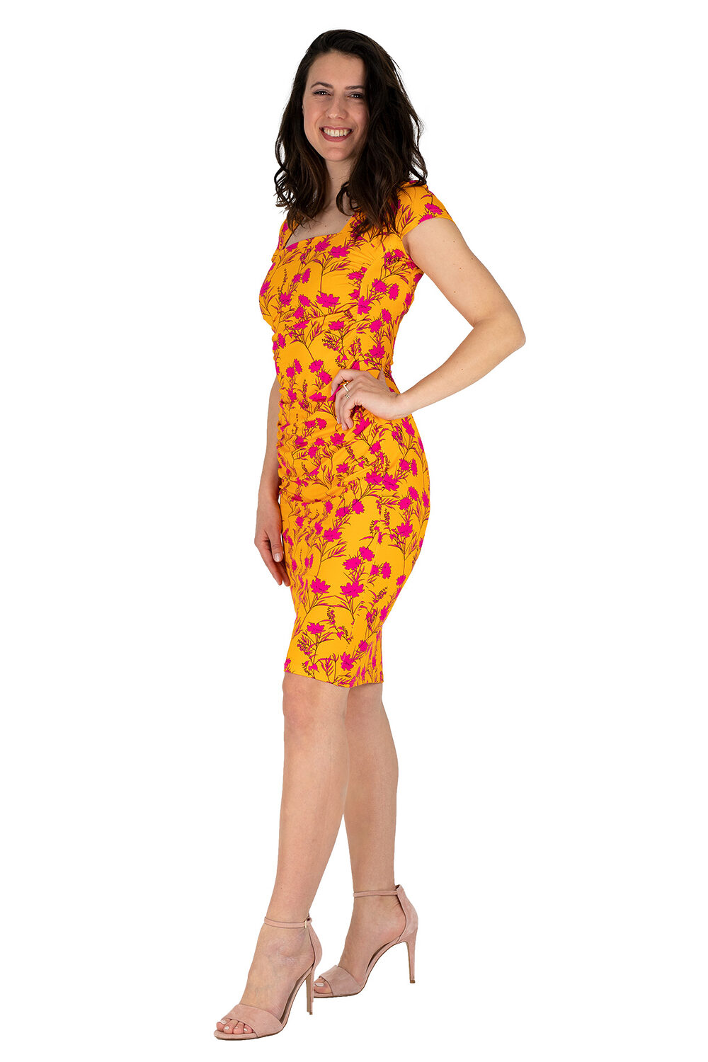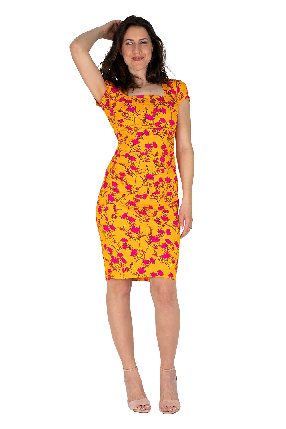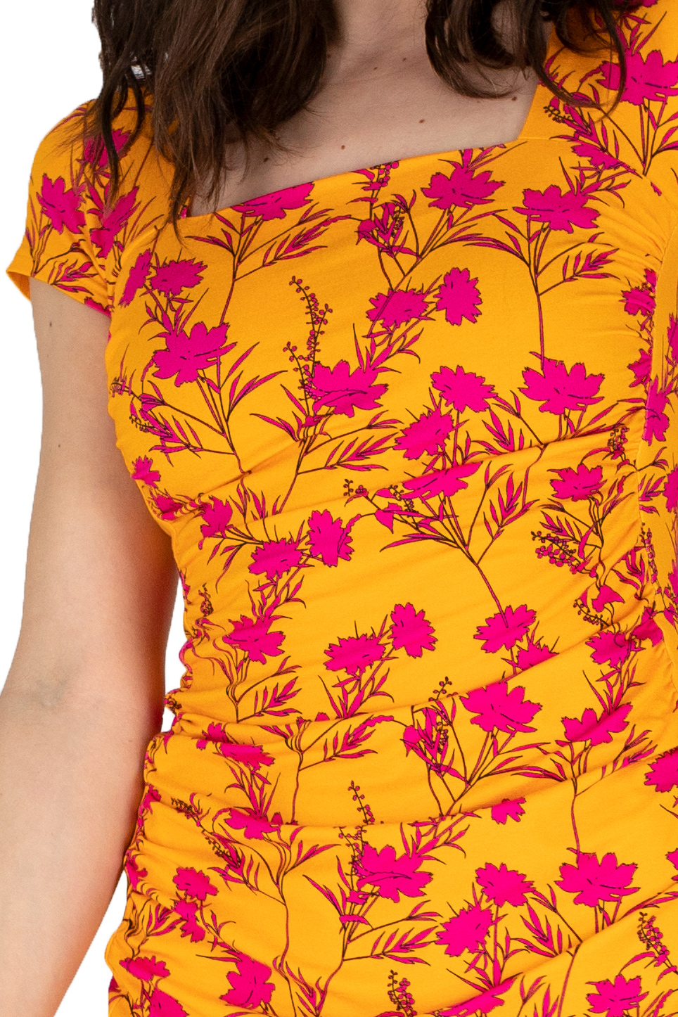 Der Karree-Ausschnitt setzt ihr Dekolleté in Szene und lässt viel Platz für schönen Schmuck.